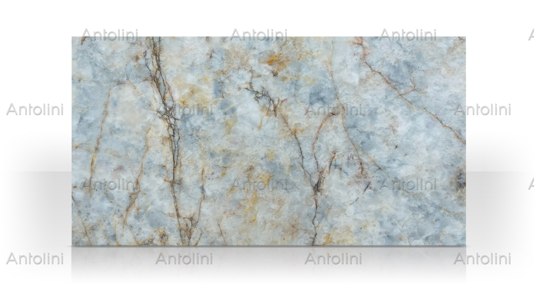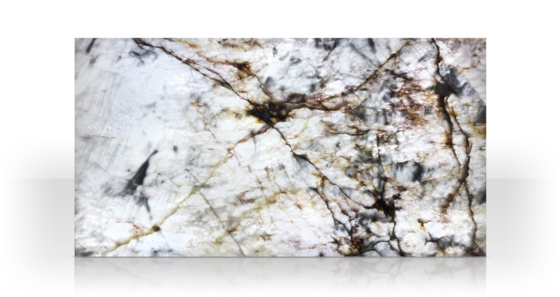 Natural Quartz, with slender dark veins that seem like traces of a land beyond which one perceives the blue of a sky filled with white clouds, in an playful illusion of depth. The earth’s crust and the heavenly bodies seem to nestle into this stone that stands out for its strength, purity and luminosity.