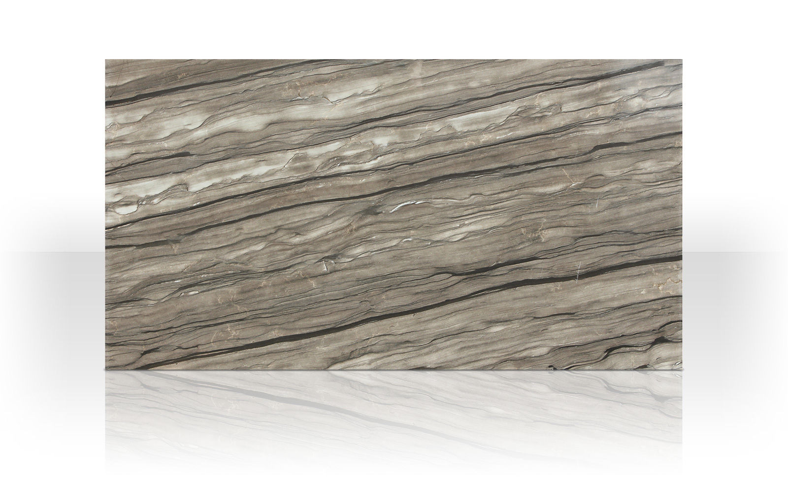 Nature surprises us once again. The range of hues from grey to brown with vivid touches of black create a combination that recalls wood, notwithstanding the particular hardness of this exotic soft quarzite.