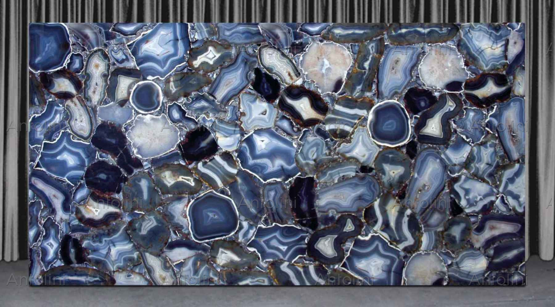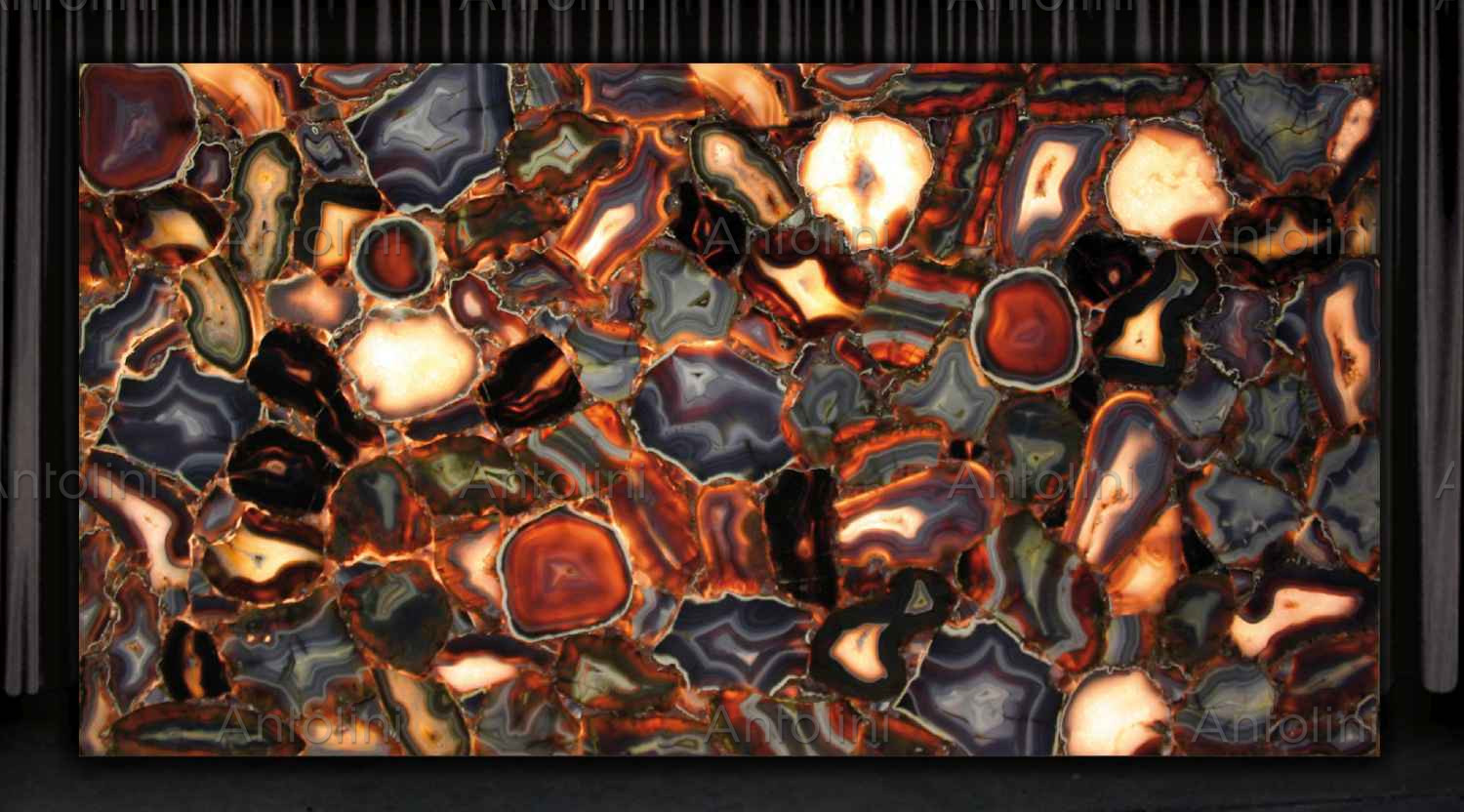 Estas piedras crean semejanzas cromáticas irrepetibles y efectos originales que decoran los ambientes, en la particular la variedad traslúcida que puede retroiluminarse.