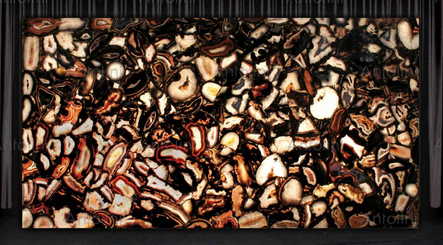 Estas piedras crean semejanzas cromáticas irrepetibles y efectos originales que decoran los ambientes, en la particular la variedad traslúcida que puede retroiluminarse.