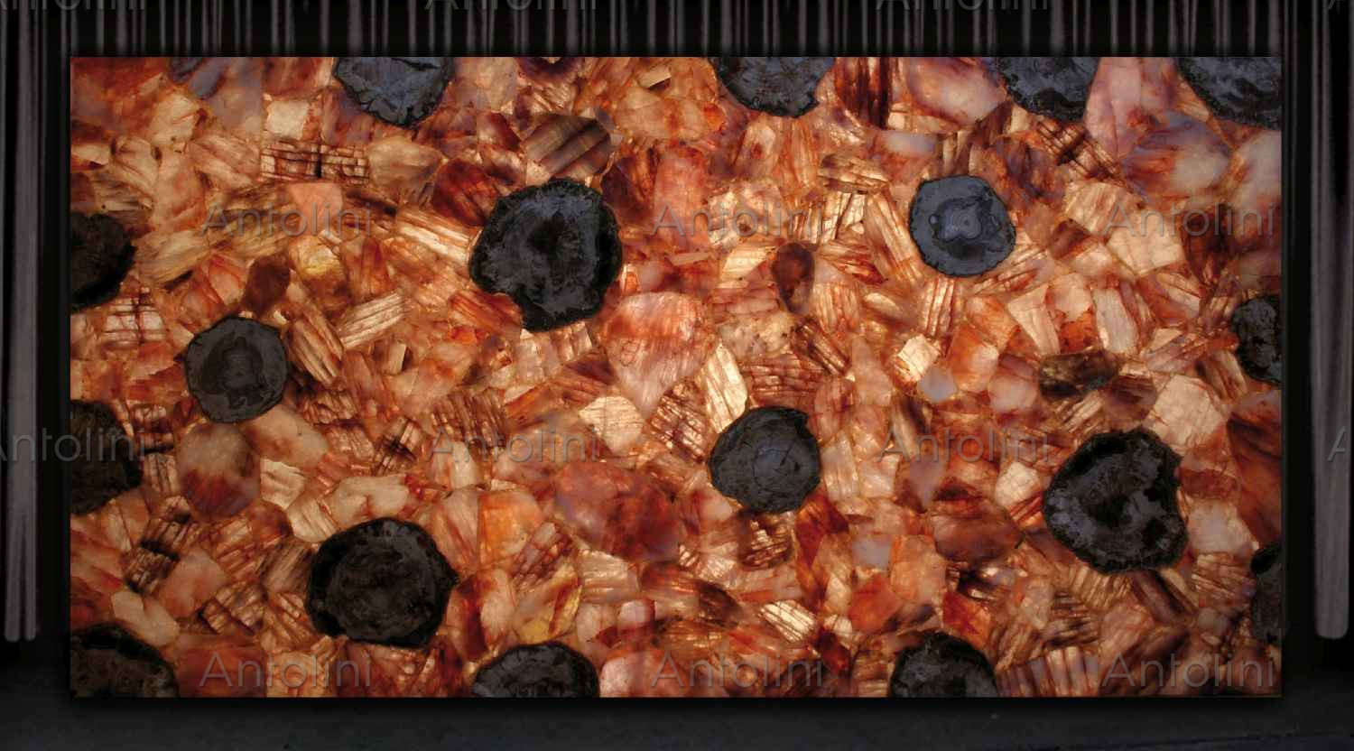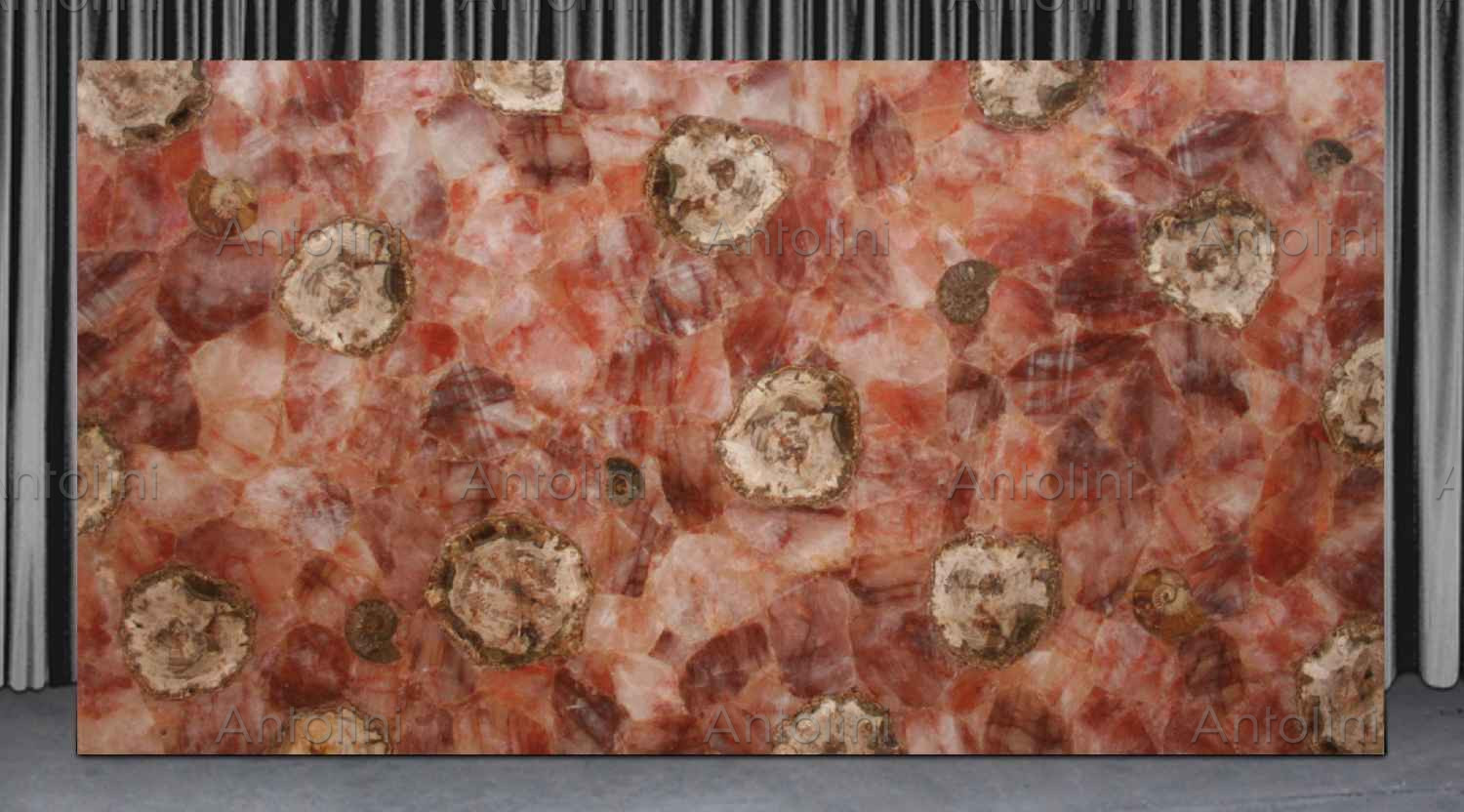 Precioustone Collection Elegancia natural. La materia original se interpreta con creatividad para dar vida a infinitas declinaciones que expresan el esplendor y la magnificencia. Más de 130 variedades de gemas preciosas y seleccionadas enriquecen la Precioustone Collection de Antolini®. Amatistas, cuarzos, jaspes y ágatas se transforman en revestimientos de clase absoluta. Estas piedras, en particular las variedades traslúcidas que se pueden retroiluminar, crean sugestiones cromáticas irrepetibles y decoran los ambientes con efectos originales.Para exaltar los espacios y donarles exclusividad.