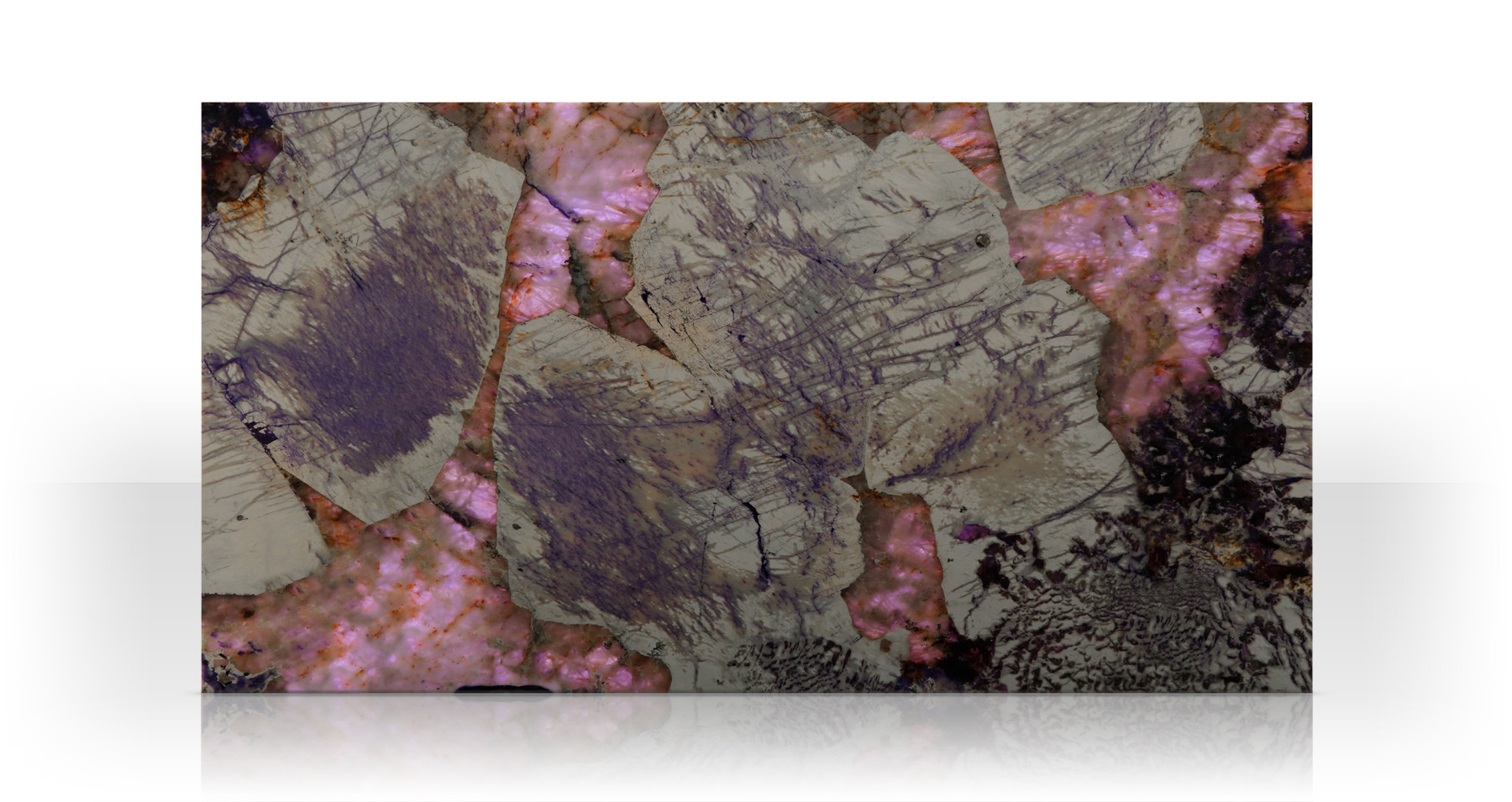 Sono paesaggi misteriosi quelli che prendono vita sulla superficie di Patagonia Viola, natural quartz attraversato da preziosi tocchi violacei, colore dionisiaco per eccellenza. Infinite distese di lavanda si rincorrono capillarmente sulla superficie creando suggestive scenografie che, retroilluminate, lasciano spazio a misteriose nebulose che arricchiscono la pietra di una preziosa e ammaliante luminosità.