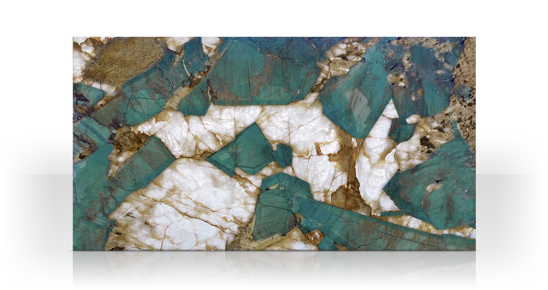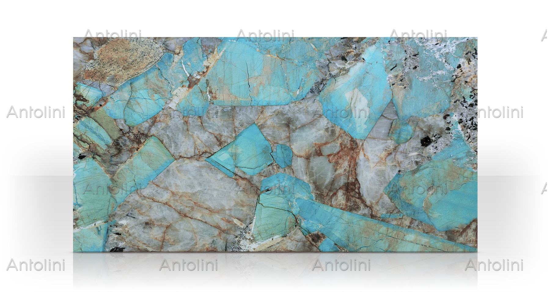 Frammento di terra che sembra racchiudere in sé l’essenza di un mare tropicale cristallino, la superficie della quartzite Amazonite Turquoise è un mosaico primordiale in cui atolli sperduti immersi in acque turchesi incontrano venature dorate e brune che ricordano la trama sottile della sabbia scaldata al sole. Ma è quando la luce la attraversa che questa quartzite rivela la sua anima più profonda: i colori si accendono, il gioco di trasparenze si intensifica e la superficie sembra trasformarsi in un portale verso mondi sommersi. Retroilluminata, diventa una finestra su paesaggi eterei, dove l’azzurro si fonde con il bianco perlaceo in una danza ipnotica che trascina lo sguardo nelle sue profondità luminose, lungo un fondale marino che muta sotto il riflesso delle onde.