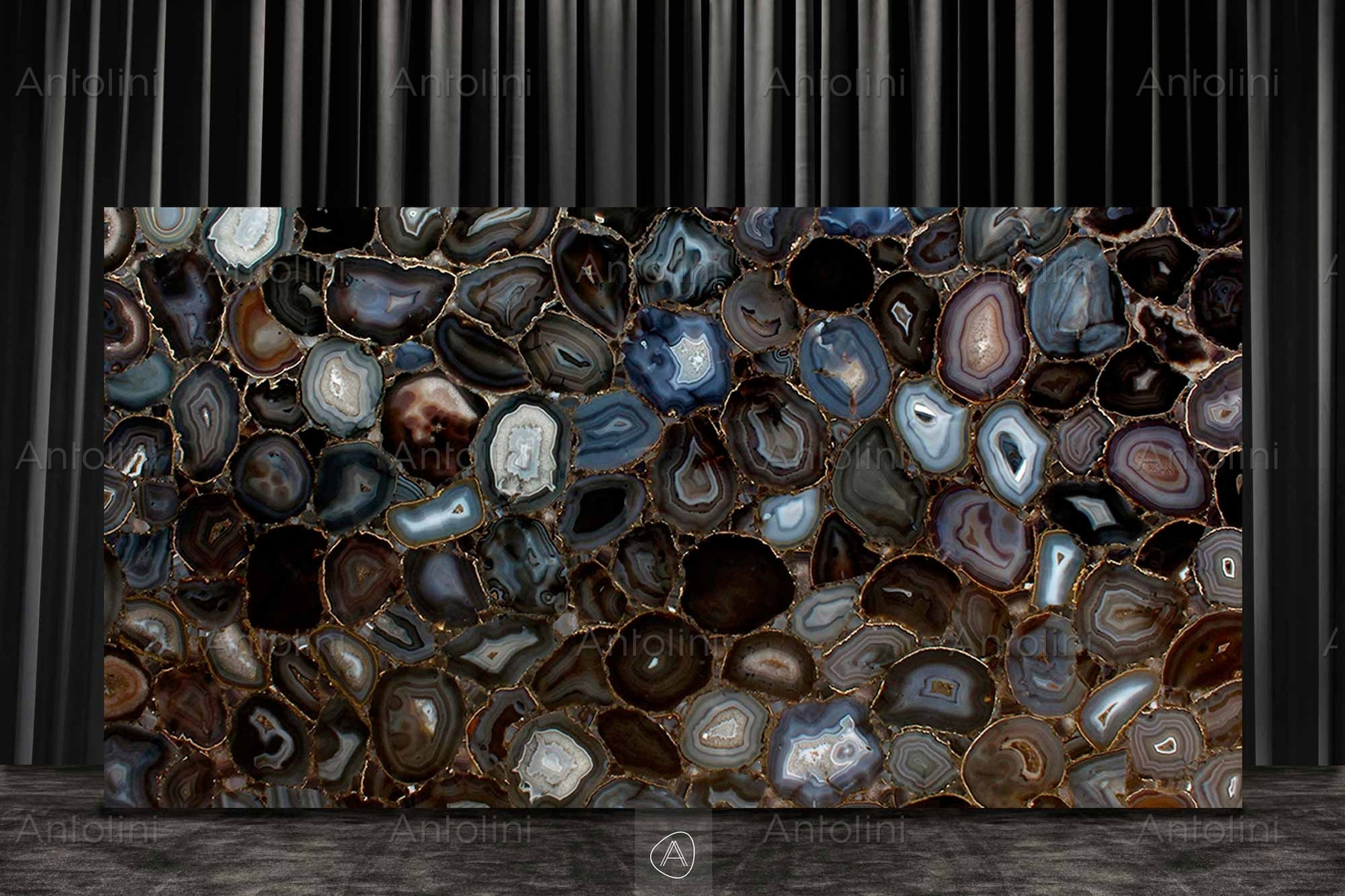 La materia originale viene interpretata con creatività per dare vita ad infinite declinazioni che ne esprimano lo splendore e la magnificenza. Più di 130 varietà di gemme preziose e selezionate arricchiscono la Precioustone Collection di Antolini®. Ametiste, quarzi, diaspri e agate si trasformano in rivestimenti di classe assoluta. Queste pietre, in particolare le varietà traslucide che possono essere retroilluminate, creano suggestioni cromatiche irripetibili e decorano gli ambienti con effetti originali. Per esaltare gli spazi e renderli esclusivi.